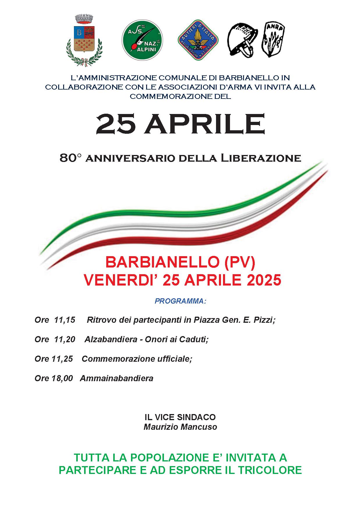 Si allega programma della Commemorazione del 25 Aprile. La cittadinanza è invitata a partecipare e ad esporre il Tricolore.