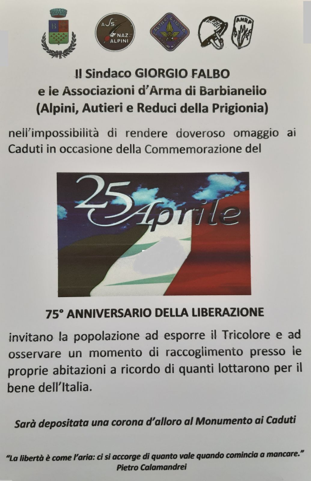 Nell’impossibilità di rendere doveroso omaggio ai Caduti in occasione della Commemorazione del 25 Aprile - 75° ANNIVERSARIO DELLA LIBERAZIONE -